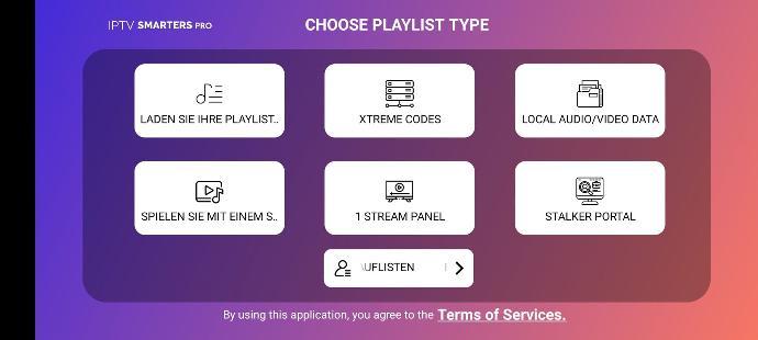Die Ansicht kann je nach Gerät leicht variieren. Du wirst Begriffe wie "Xtream Codes", "Server", "Player" oder "API" sehen – wähle diese Option aus. Wenn alles richtig eingerichtet ist, wirst du das Anmeldebild der App vom nächsten Schritt sehen.